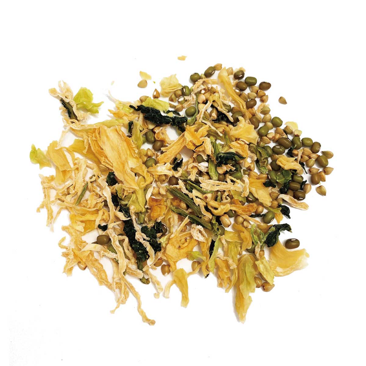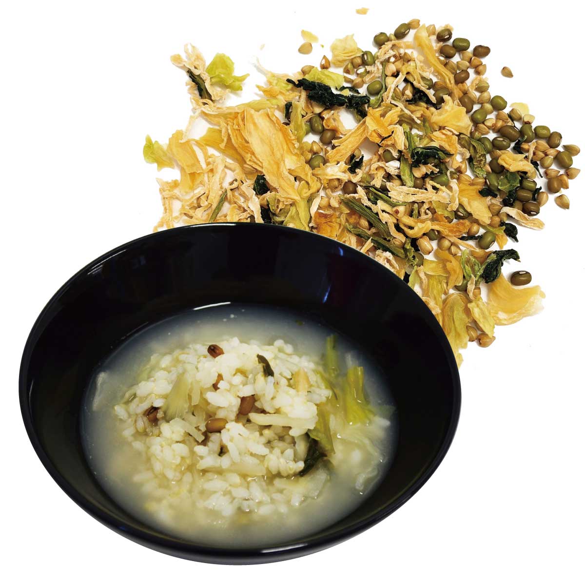 - 原材料:7分づき玄米、蕎麦の実、緑豆、キャベツ、玉ねぎ、だいこん、小松菜